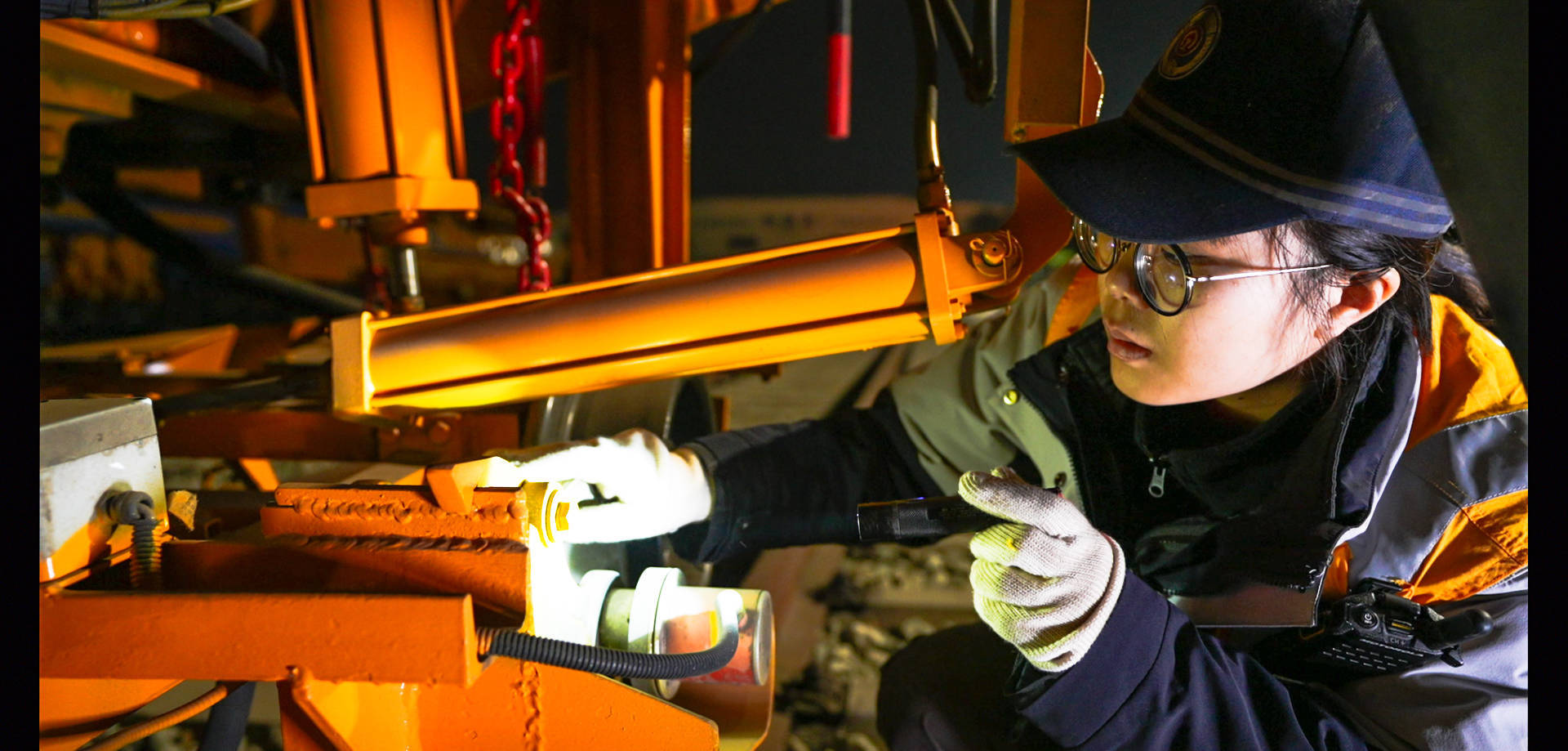 凌晨,陈雪梅摘车前在检查车钩状况。新华社发(董瑞鑫 摄)20时30分,陈雪梅和工友们开始对捣固车、稳定车开展出乘前全面检查,从仪表盘精度到操纵杆灵敏度等工作内容,逐一核对调试,确保每台“钢铁巨兽”状态良好。这是春运线路养护的第一道关,容不得半点马虎。