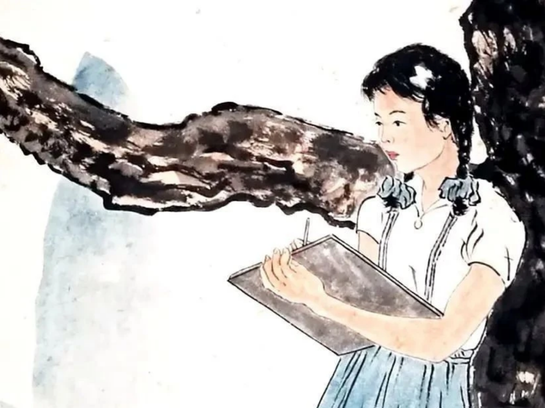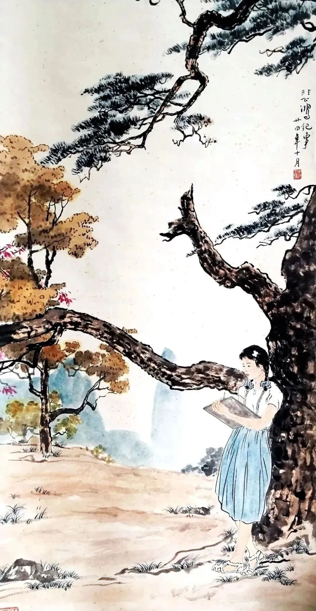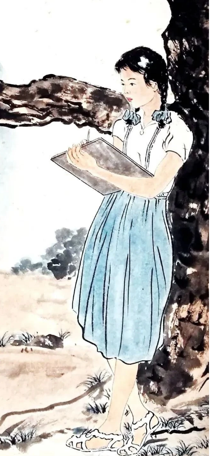 这画里,焦点全在近景那个写生的少女身上,远景的山啊、树啊,都成了模糊的背景板。为啥这么画?还不是因为徐悲鸿眼里只有孙多慈,哪还顾得上其他。那少女斜倚松树,左手执画板,右手执笔,眼神却飘向远方,这不就是在想徐悲鸿嘛!