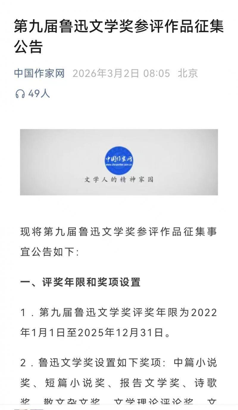 2026年3月2日,中国作家网发布第九届鲁迅文学奖参评作品征集公告山西股票配资网站,将对反映新时代现实生活、塑造时代新人形象、书写以中国式现代化全面推进中华民族伟大复兴的作品等重点关注。