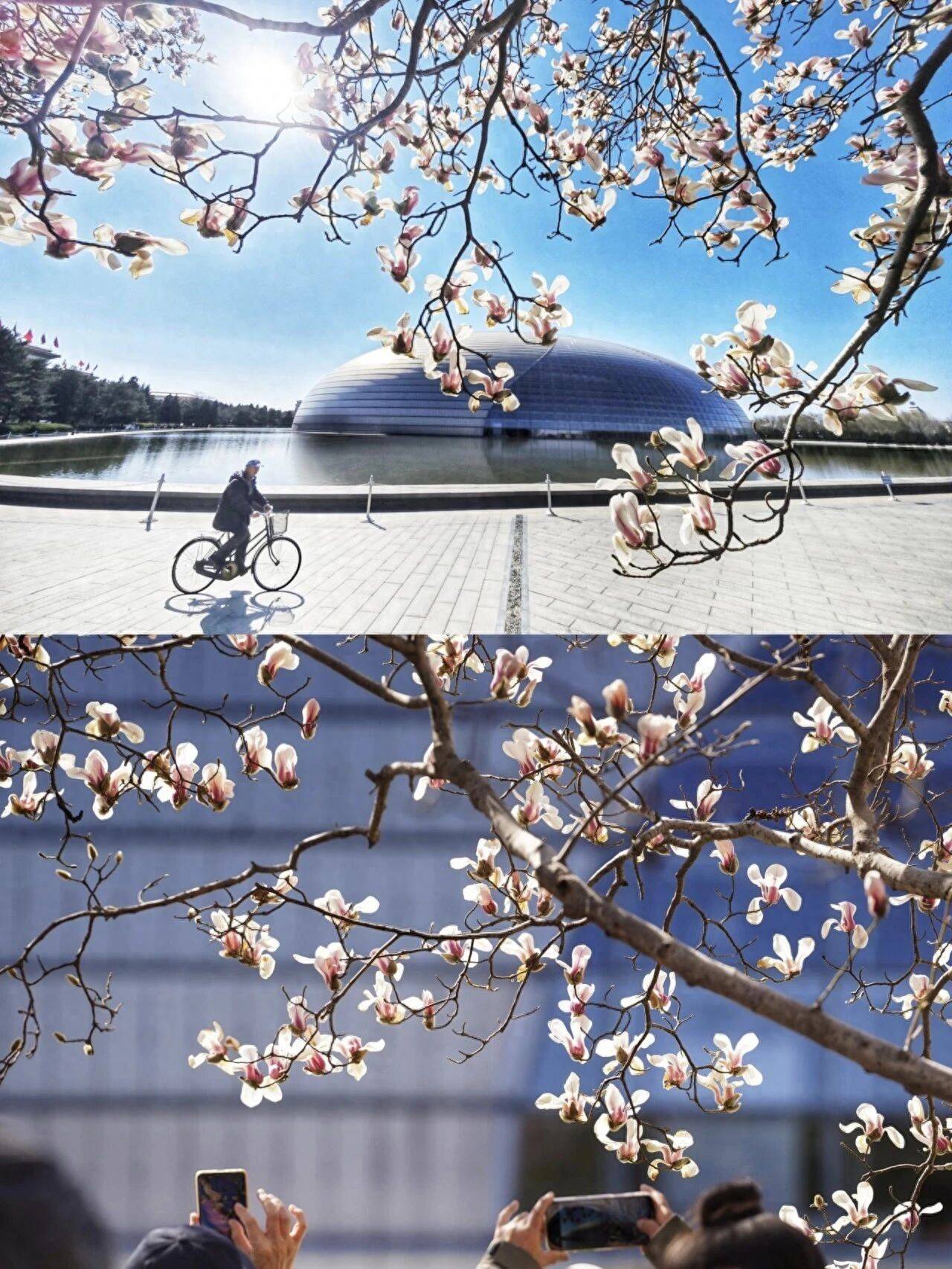 近日,国家大剧院望春玉兰迎来盛花期。洁白的花朵缀满枝头,与剧院现代感的穹顶、水面交相辉映,勾勒出长安街醉人的春景,吸引不少市民、游客前来驻足、赏花、拍照留念。(图/sipa图库)