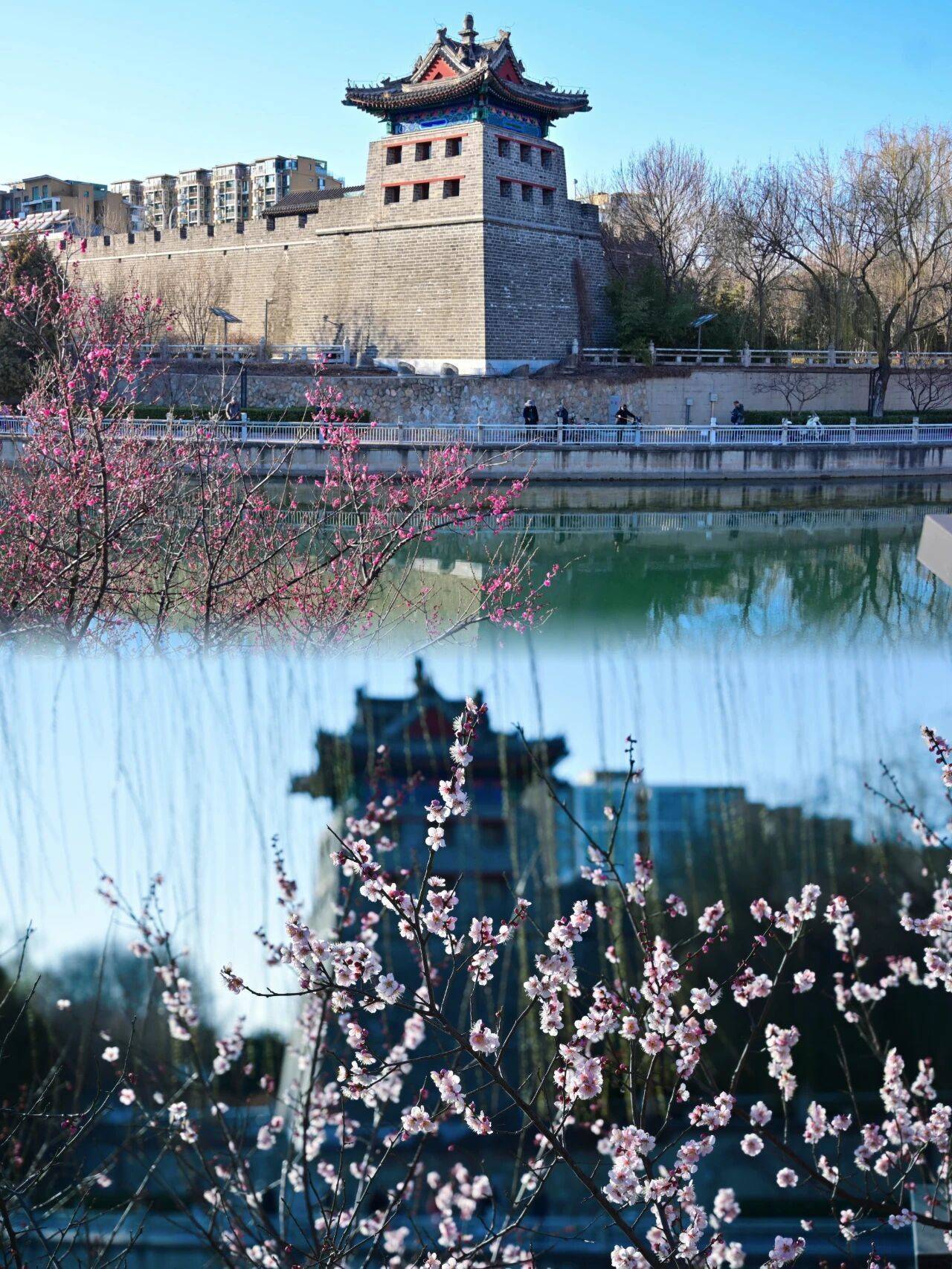 3月11日,天气晴好,左安门角楼下,梅花次第开放,市民游客沿着护城河畔的滨水绿道踏青赏景,感受春天的气息。