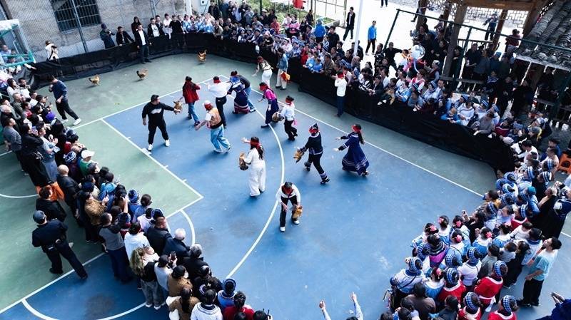 活动以庄重的“祖先送别”仪式开篇,罗悃镇河东村的寨老身着布依传统服饰,手持艾草束、竹枝,带领舞狮队伍沿村寨街巷逐户巡游,鸣锣击鼓、吟唱祈福歌谣,清扫门庭以祈福纳祥。这一传承数百年的仪式,是布依“洒向”文化的核心。据悉,“洒向”为布依语音译,意为“完年”,罗甸布依族群众过年习俗贯穿正月,正月最后一天群众齐聚村寨,恭送祖先、共商农事,宣告年节结束。