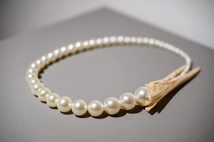 传统并非一成不变的历史遗产,而是一种持续被重写的文化结构。正如艾略特所言,艺术家的创新并非脱离传统,而是在创造中“重新组织过去的秩序”。在“传统之化”板块,观者可以看到女性艺术家如何以自身经验介入并转化民间工艺,将看似固定的传统化为当代的表达。其中,此次展览海报上的作品即是李维伊《衔尾蛇项链》,以人造珍珠与剥制青鱼头骨为材料,看似不相关的两种材质首尾相连,形成人工与自然的交汇。而索尼娅·纳瓦罗的《STIRPAI》则是注重传统工艺,并用细茎针茅或废弃材料为创作媒介,展现其与既定社会规范的抗争,