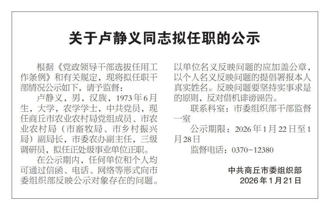 关于卢静义同志拟任职的公示