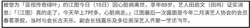 很快港媒向田启文求证,田启文确认了消息属实,并透露江图是在4月15日早上7点多突发心脏病离世。