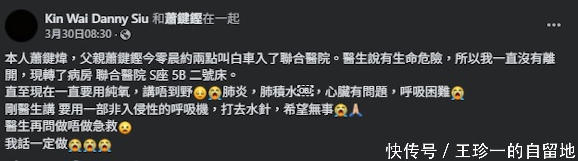 今年3月,他的儿子萧键炜曾发文透露父亲出现肺炎、肺积水、心脏及呼吸问题,需使用无创呼吸机及持续吸氧,医生也曾告知有生命危险。