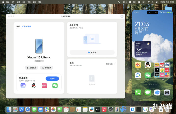 其次Mac,可镜像小米手机桌面。在Mac上安装小米互联服务,登录同一个小米账号和WiFi就可以连接了。