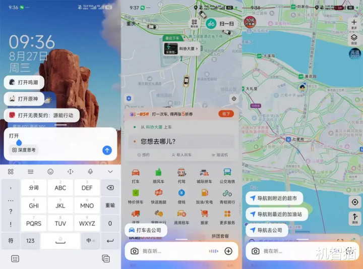 第二个是小爱建议,唤醒小爱后,它会根据屏幕内容,主动给出建议和功能。比如看文章时,1秒快速收藏和生成摘要;打开地图,自动推荐可能会用到的地点;打开滴滴,选择“打车回家”,一键即可打车;打开京东,查看最近订单等。