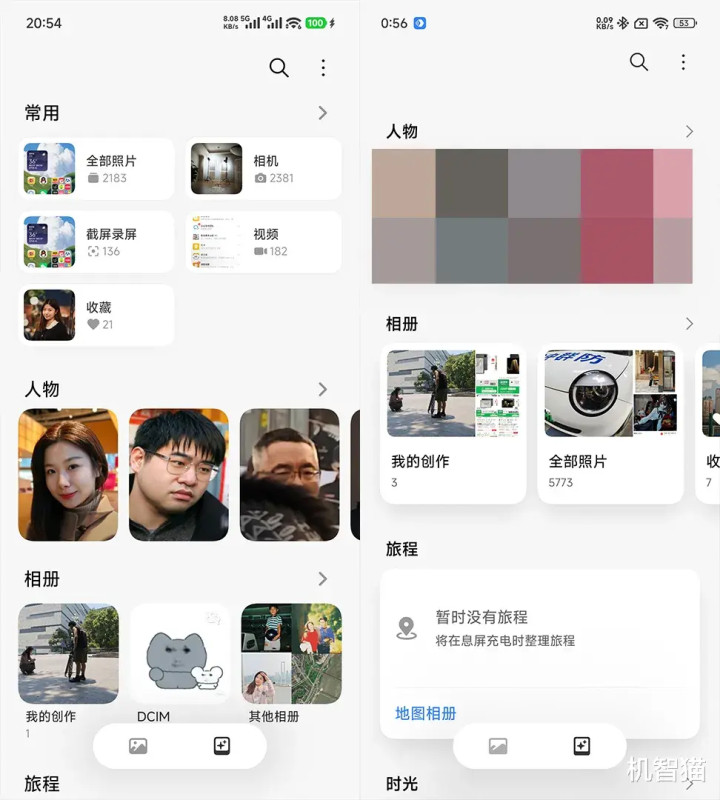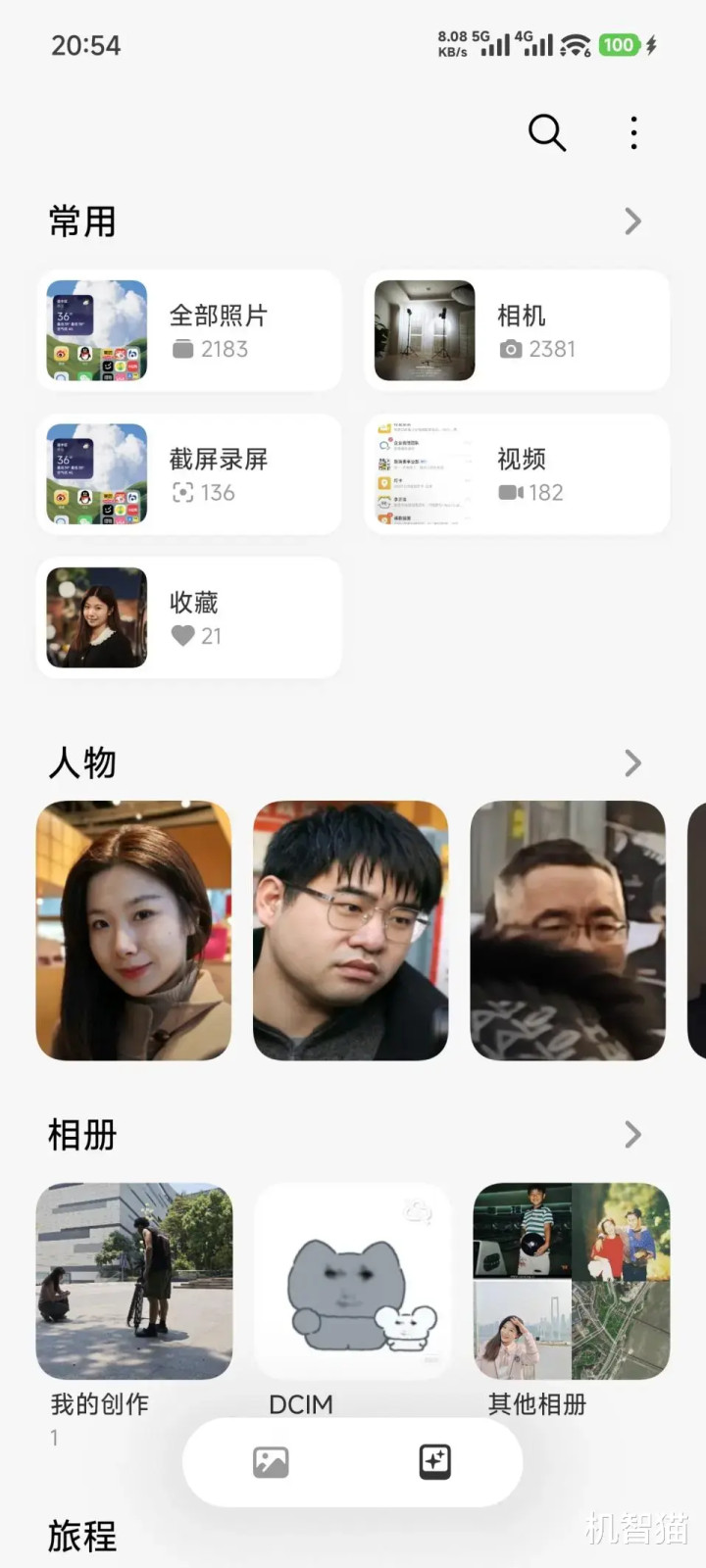 澎湃OS 3的相册调整了分类展示逻辑,常用的相机、视频、截屏等全部直接放置最上面,终于回到该有的使用逻辑,接下来人物、那年今日、其他相册、创作以及其他功能等放在下方。