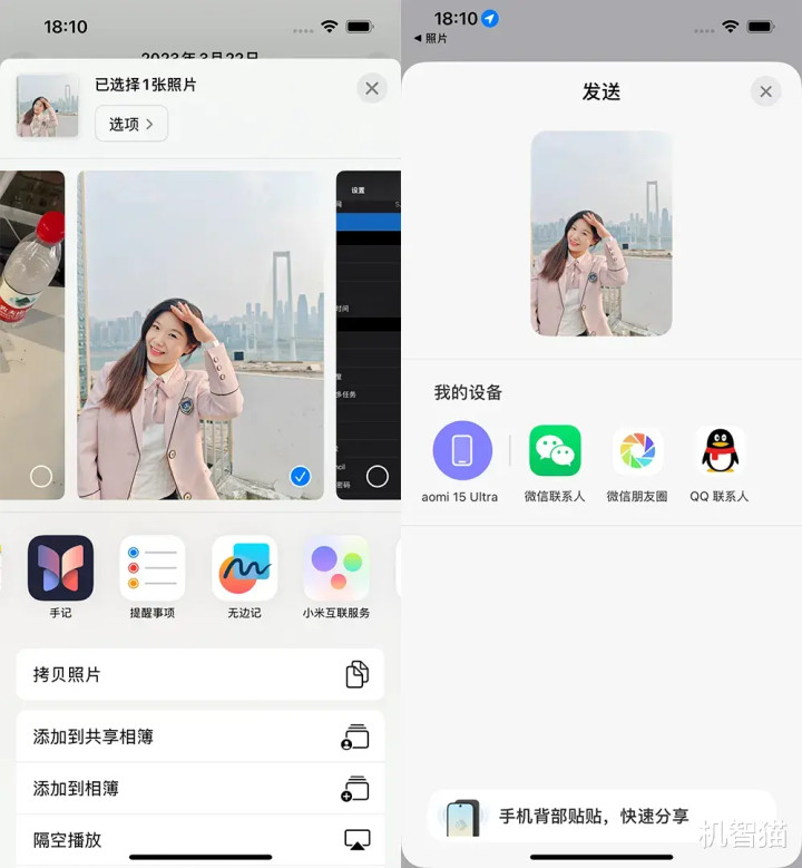 iPhone的照片可以通过小米互联服务发给小米手机,或者通过“手机贴贴”,即打开NFC、WiFi、蓝牙后将手机贴在一起传输。顺带一提,除了照片,视频、文件、WiFi密码、联系人,网址等都能通过“贴贴”的方式传输。