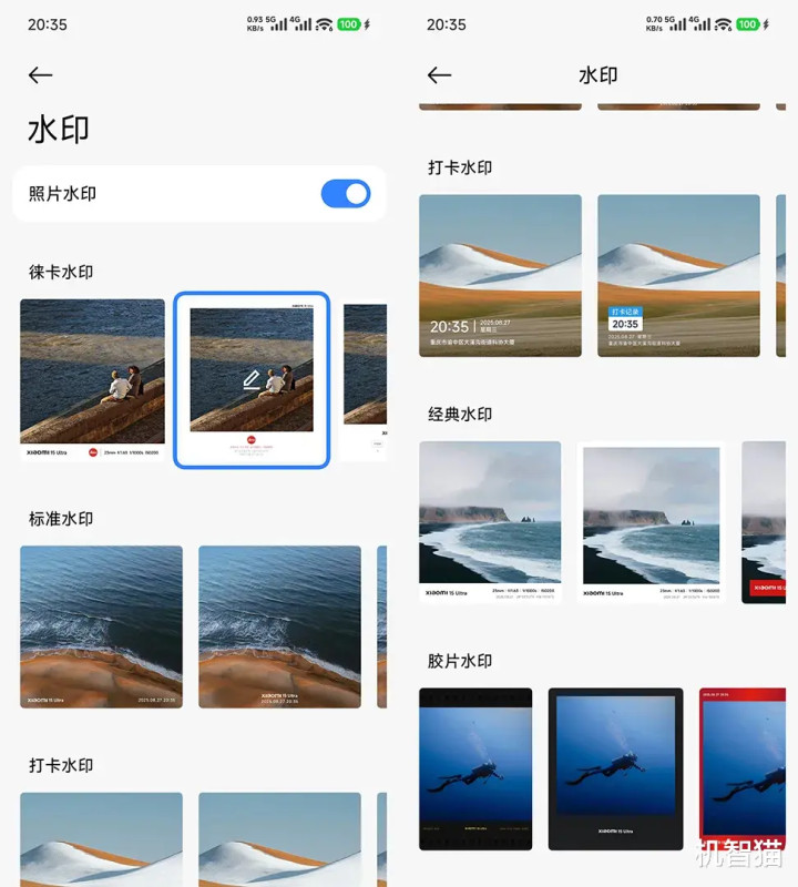相册编辑直接预装的最新版本,之前用户反复提到的文字导航功能也一同上线。相机的直出水印也有了更新,,并且每个水印都给了很多设置选项,可玩性和选择空间大大增加。相较之下,澎湃OS 3功能层面的变化更大,就是全新的超级岛。